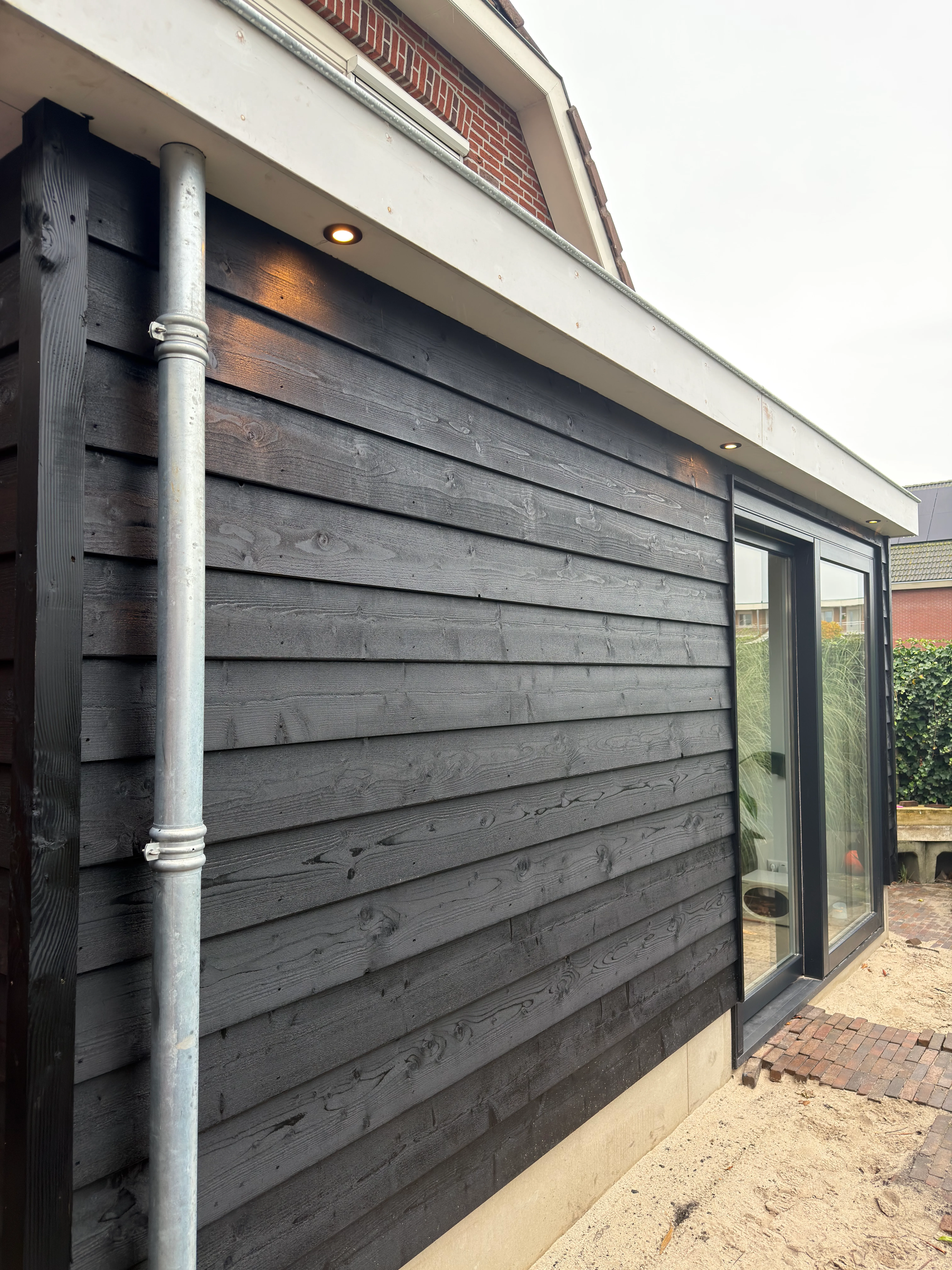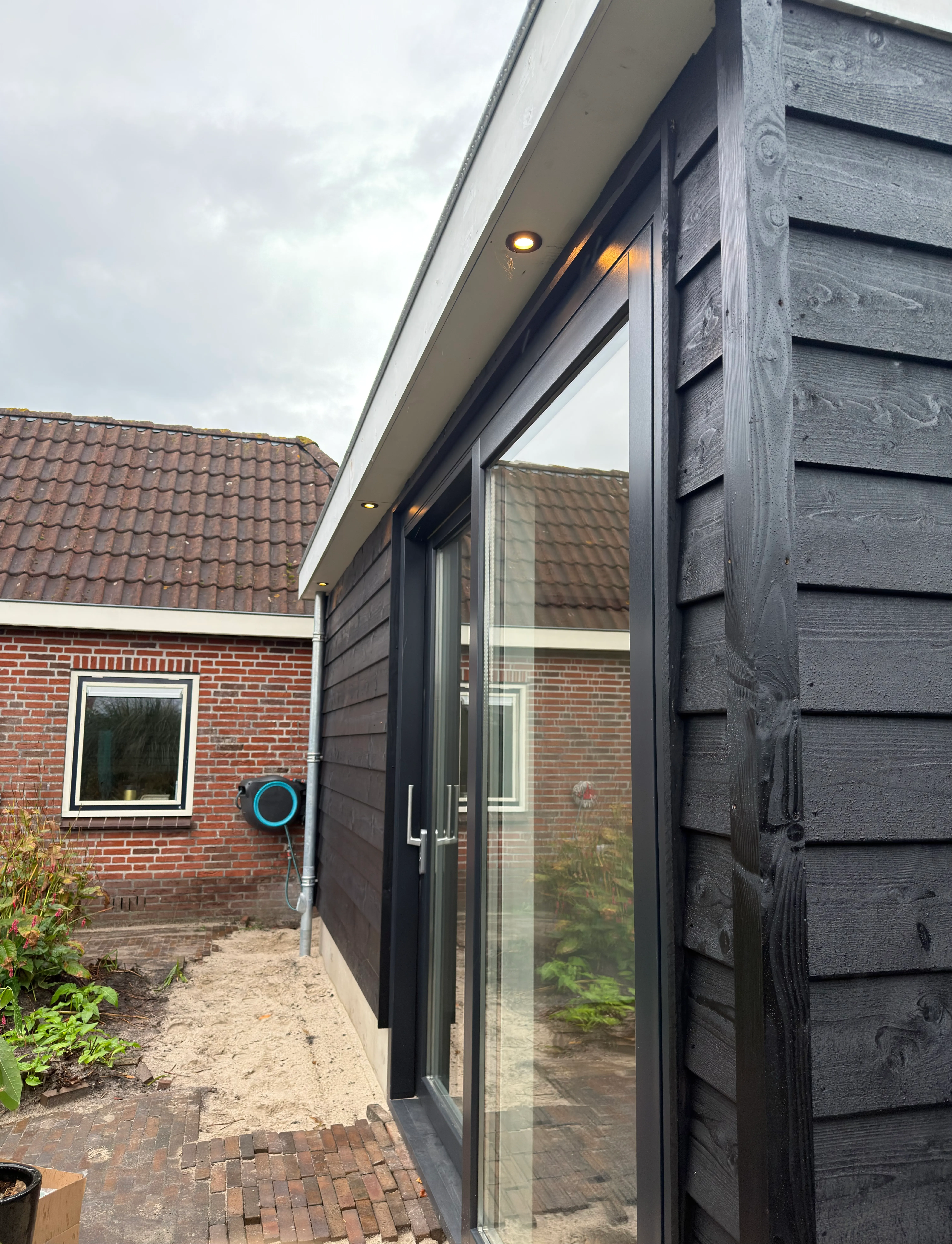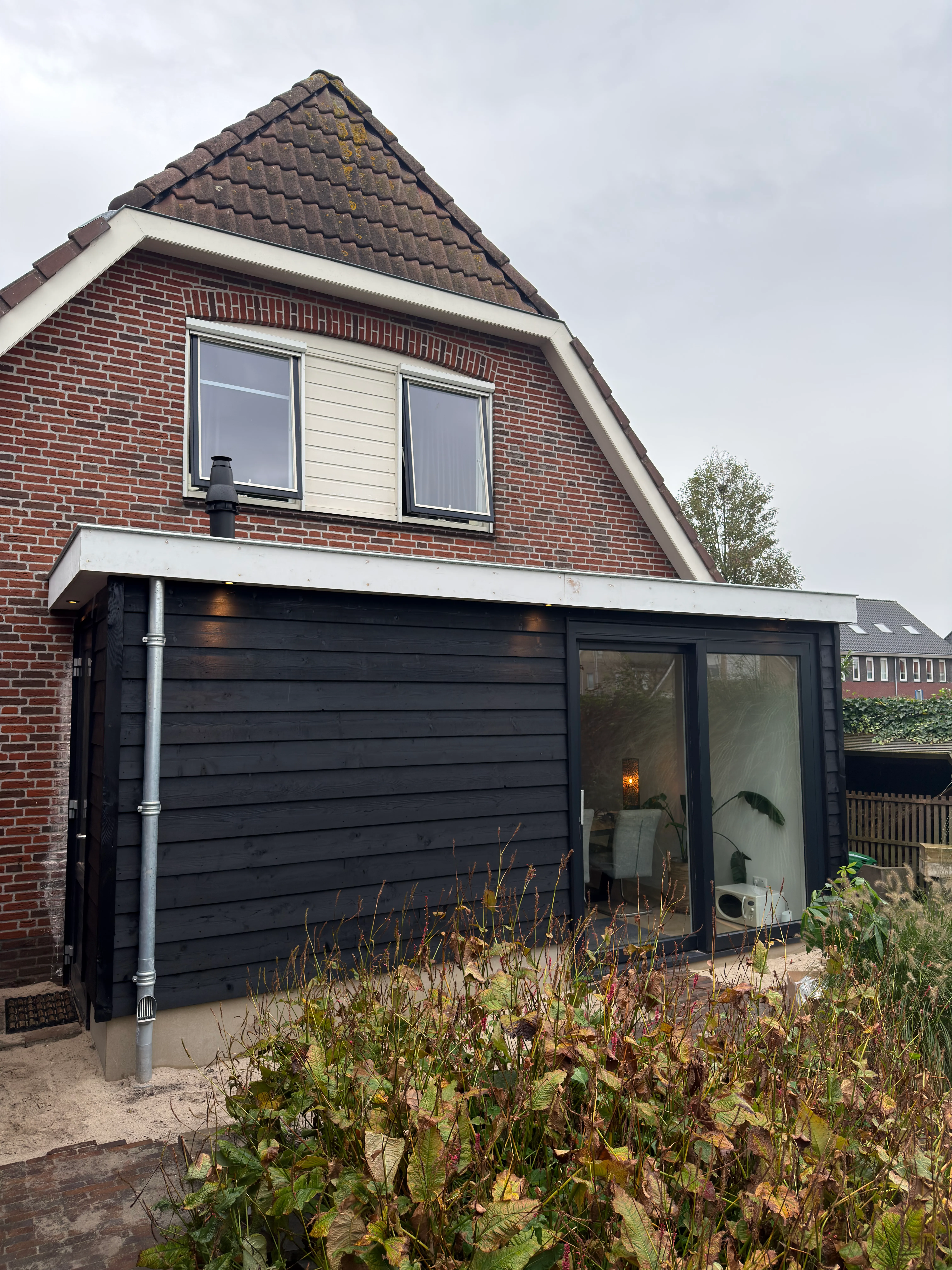 Bij deze woning hebben wij een moderne houtskelet aanbouw gerealiseerd. De aanbouw is volledig opgebouwd uit hout, wat zorgt voor een duurzame constructie en uitstekende isolatiewaarden. De ruimte is voorzien van kunststof kozijnen, waaronder een groot schuifpuikozijn dat binnen en buiten naadloos met elkaar verbindt. Hierdoor ontstaat een ruimtelijk gevoel en valt er veel natuurlijk licht binnen.