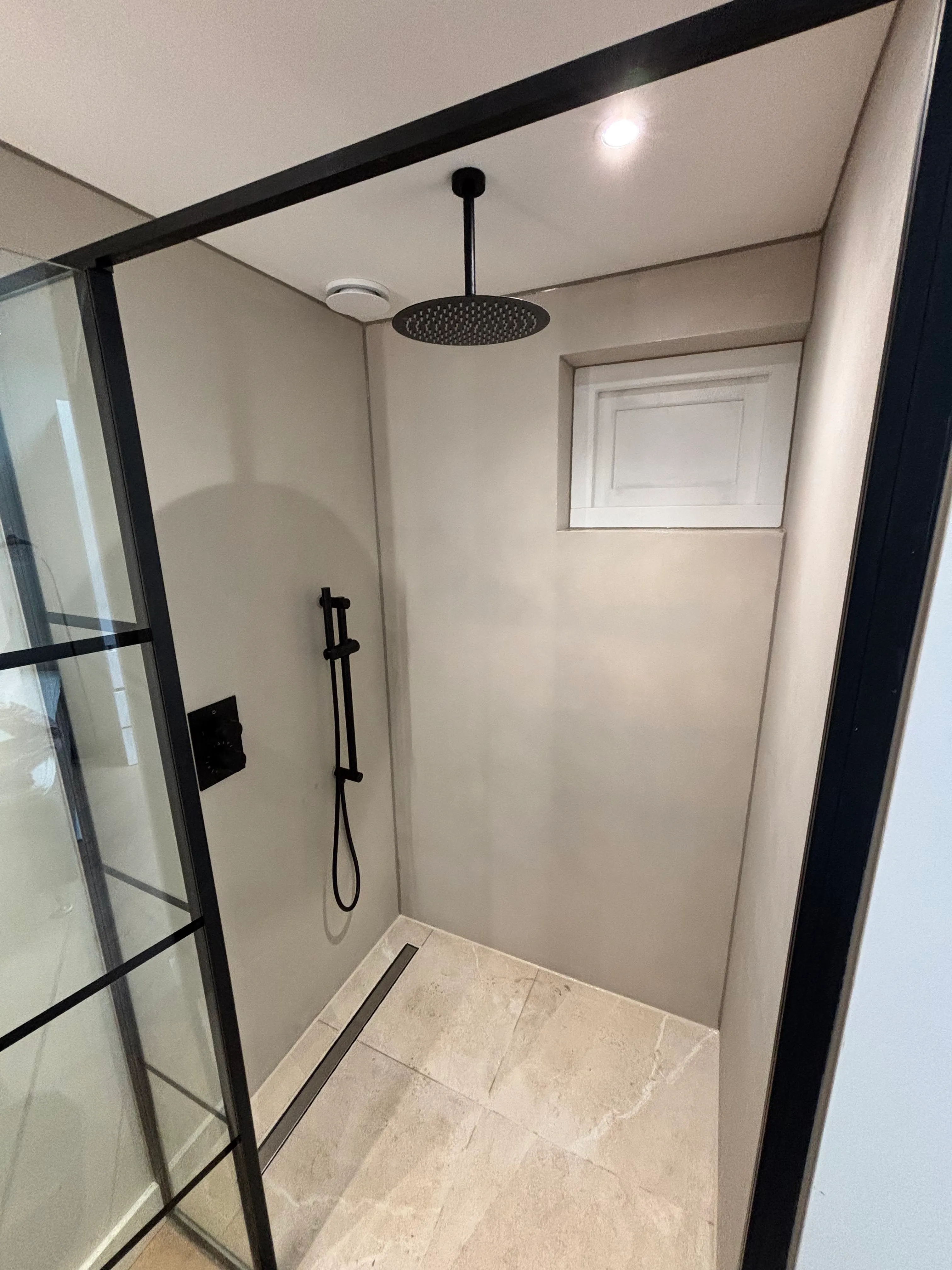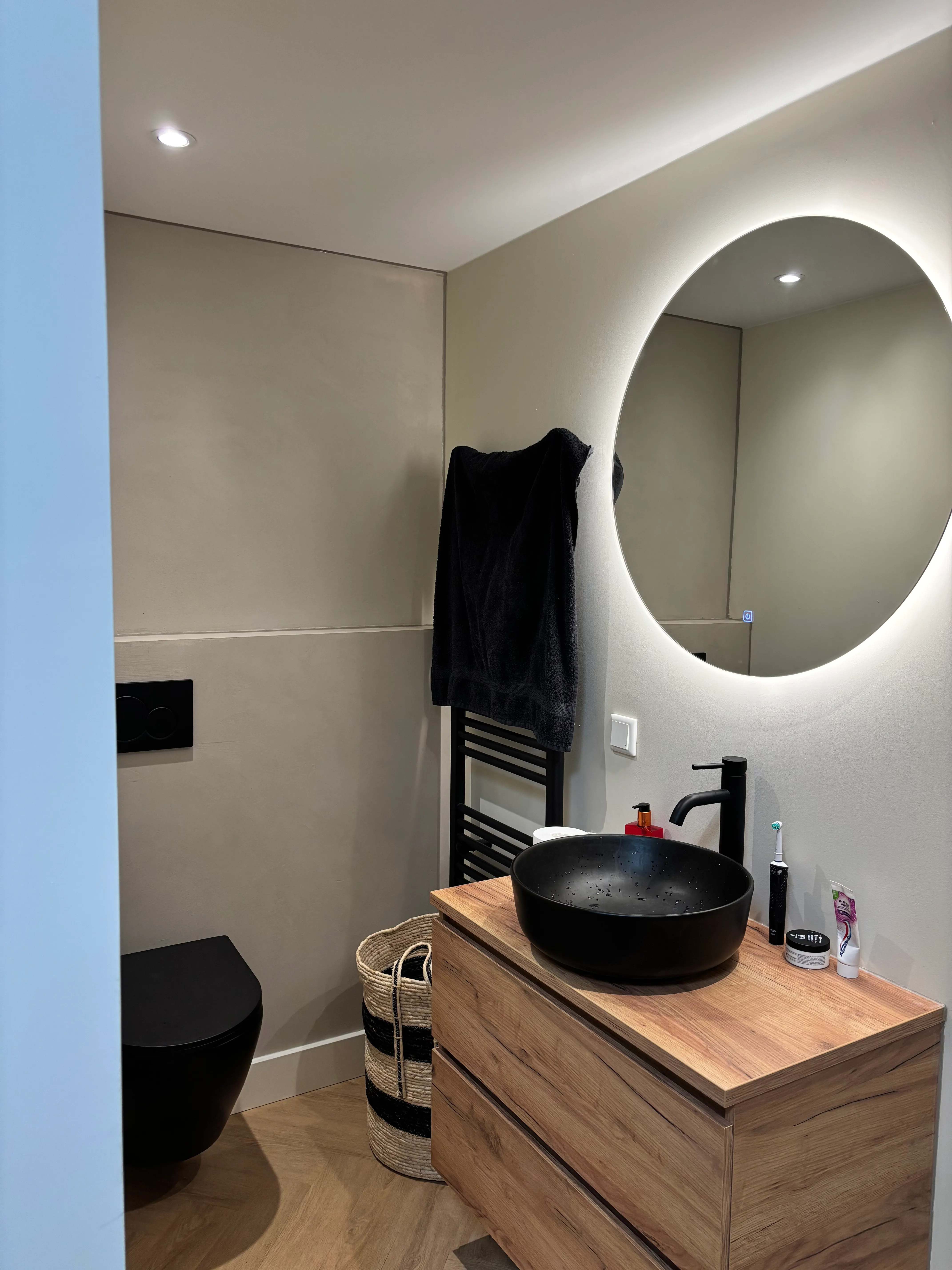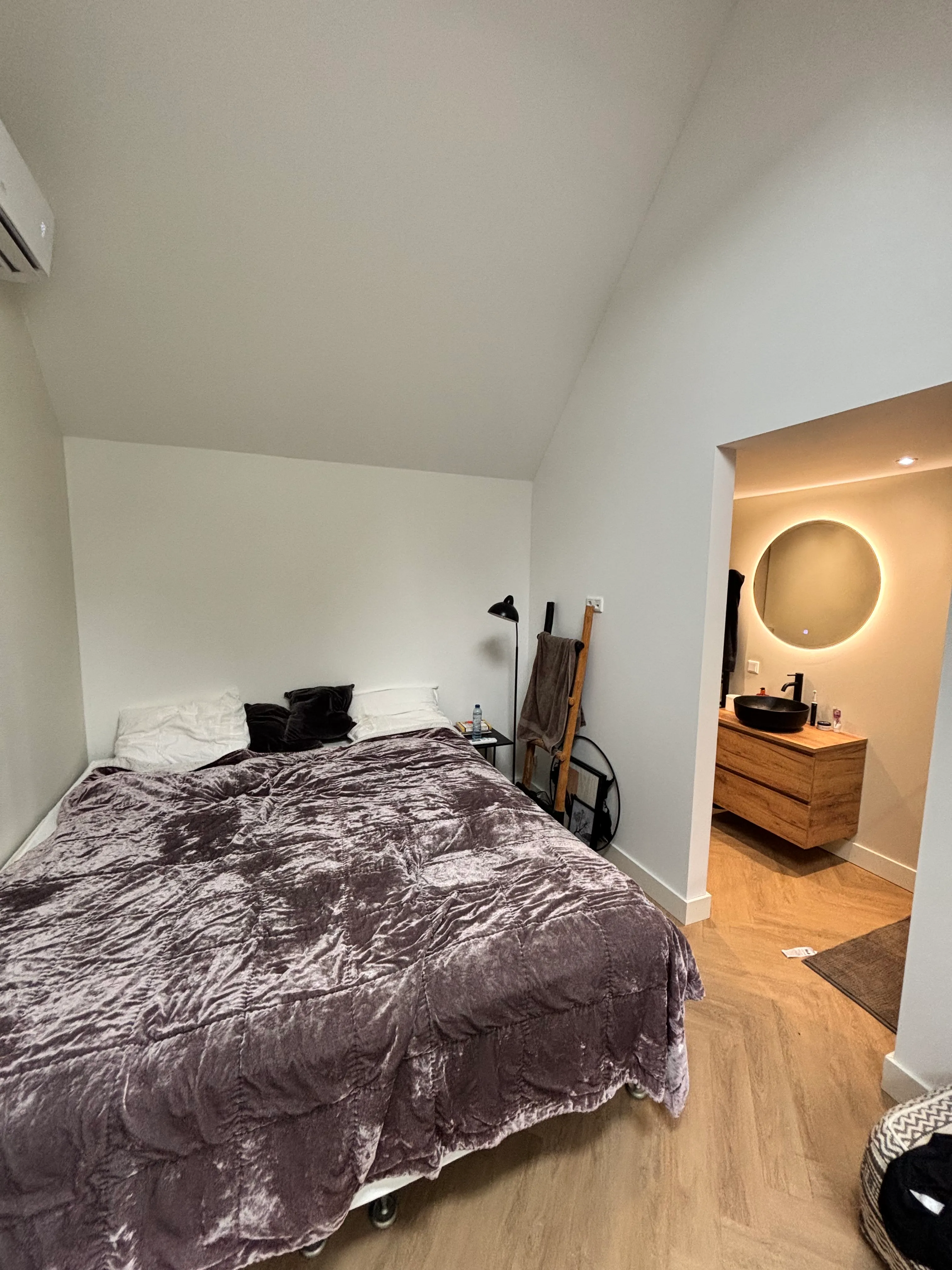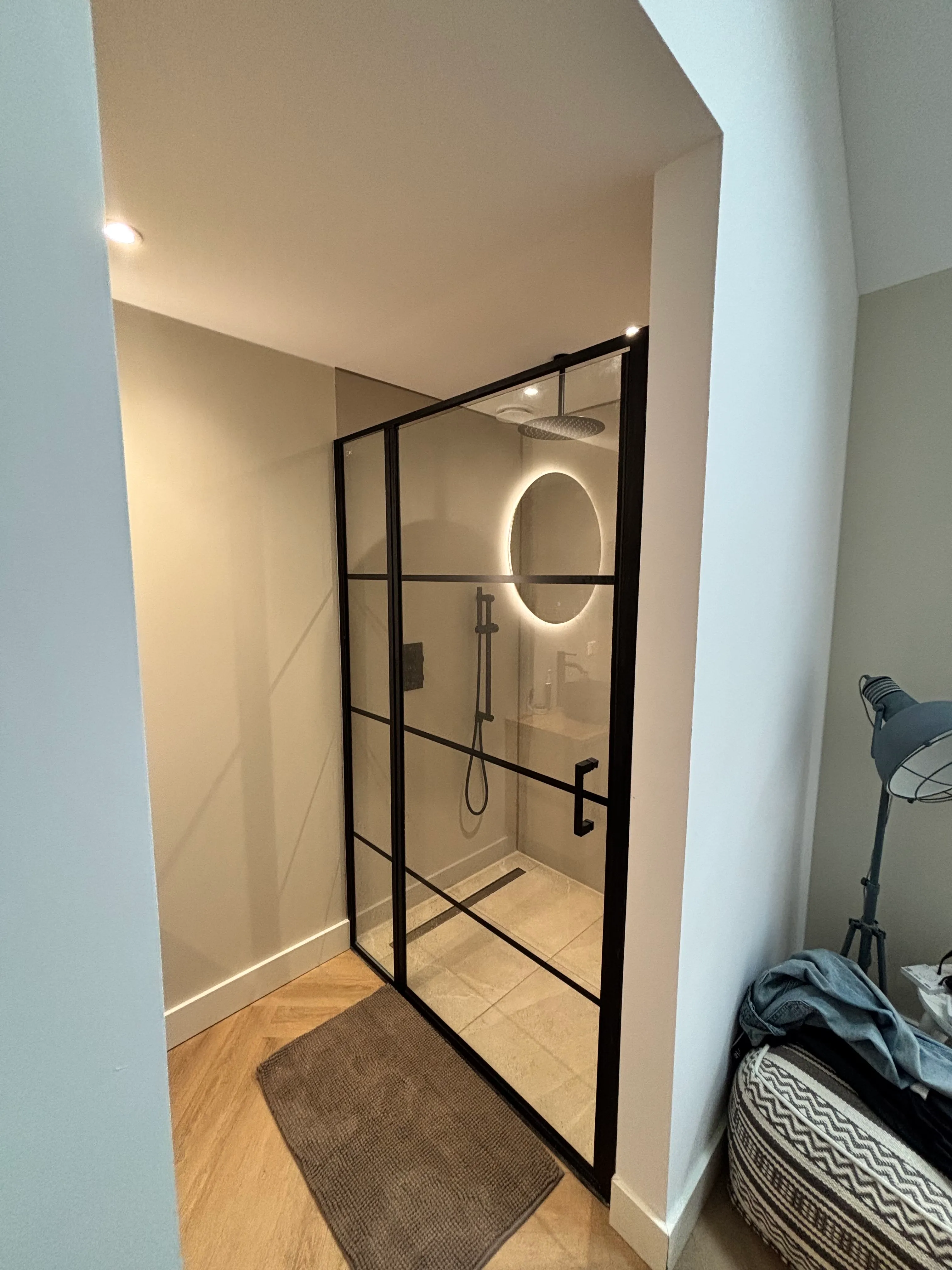 De badkamer is uitgerust met een douche en toilet en vormt een functioneel geheel naast de slaapkamer. De bestaande schuurdeur is verwijderd en vervangen door een nieuw houten kozijn met dubbele deuren, zodat de ruimte optimaal gebruikt kan worden.