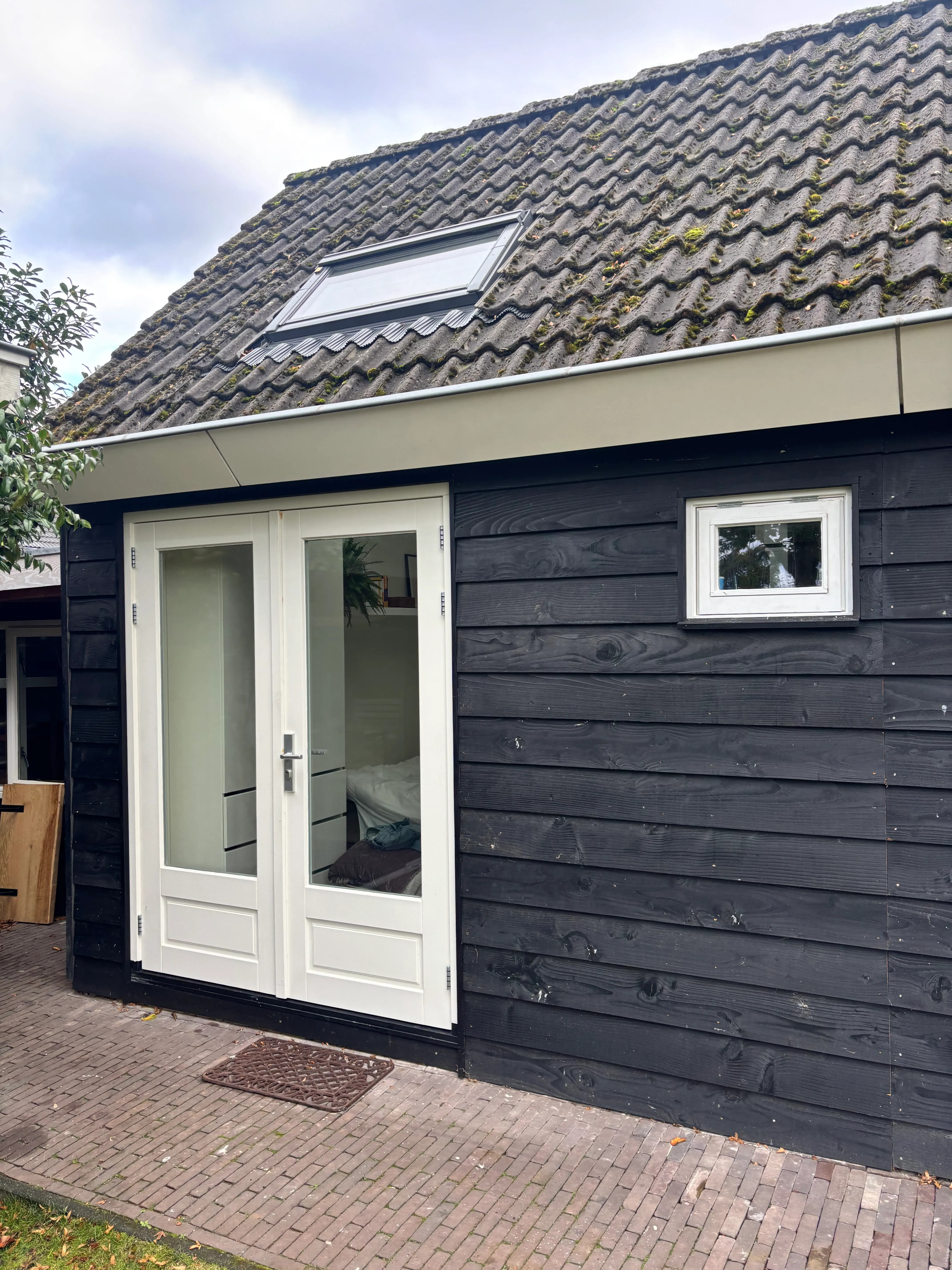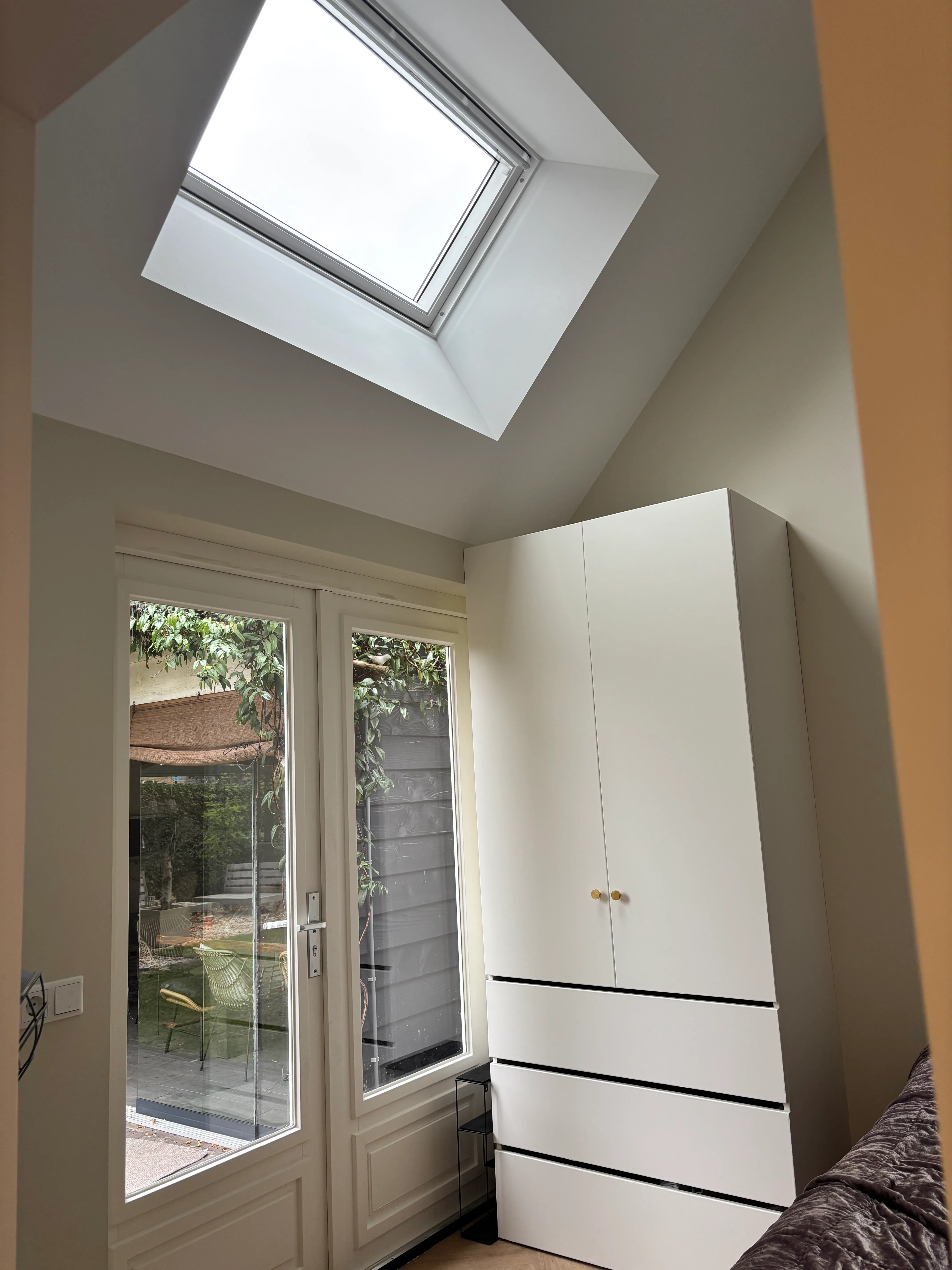 De nieuwe slaapkamer en badkamer zijn volledig geïsoleerd om een comfortabel en energiezuinig binnenklimaat te creëren. Daarnaast hebben wij nieuwe openslaande deuren met grote glasvlakken geplaatst, waardoor er veel extra daglicht binnenkomt en er een mooie verbinding ontstaat tussen binnen en buiten. Het geplaatste dakraam zorgt voor nóg meer natuurlijk licht, wat bijdraagt aan een lichte, ruime en aangename leefomgeving.
